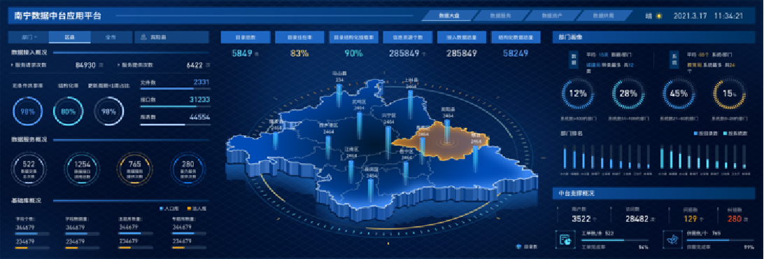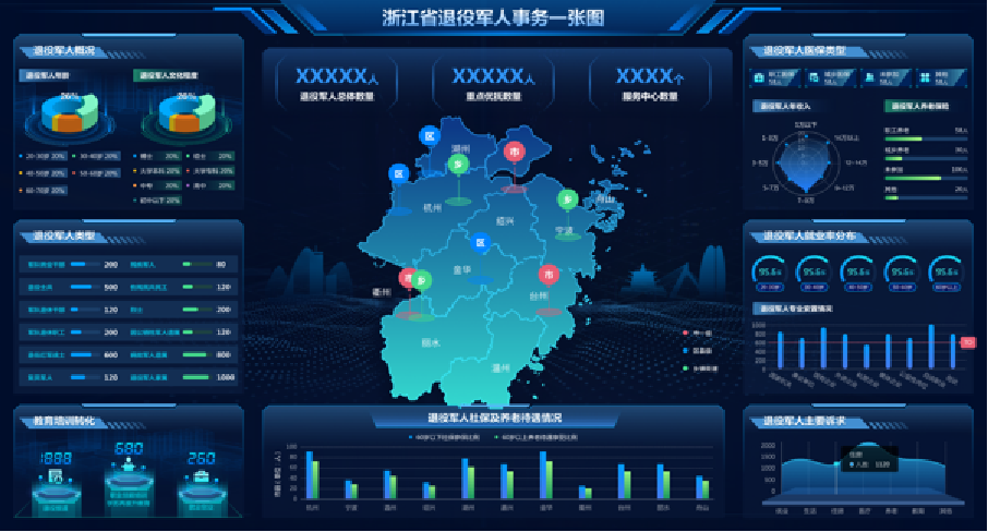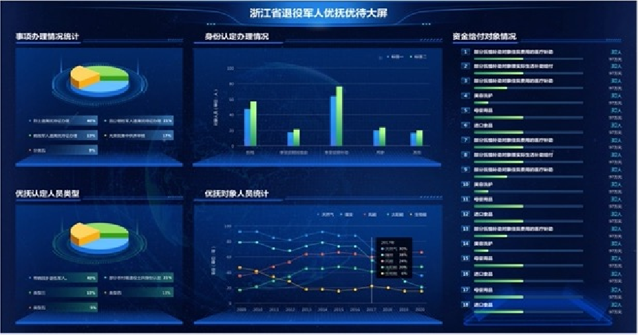 通过数据分析“一张图”实现退役军人各类数据的综合分析,构建退役军人画像模型、决策分析模型;并通过大屏和仪表盘等可视化的方式直观展现。