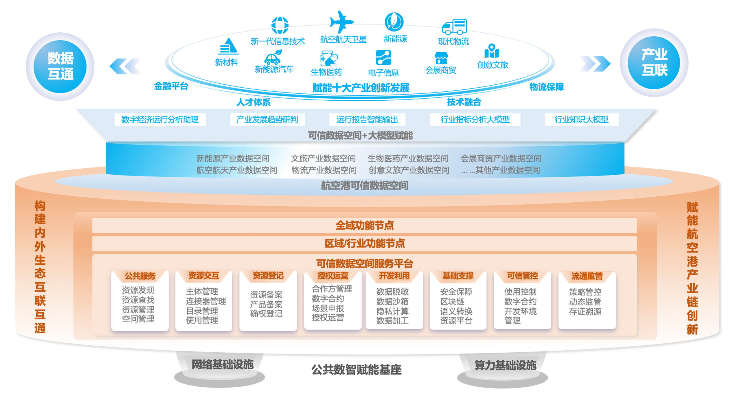 融合数字经济系统涉及的省/市/县级部门公共数据,归集各细分行业产业及各企业的公开数据,实现跨政府、跨产业、跨企业的资源及数据整合。